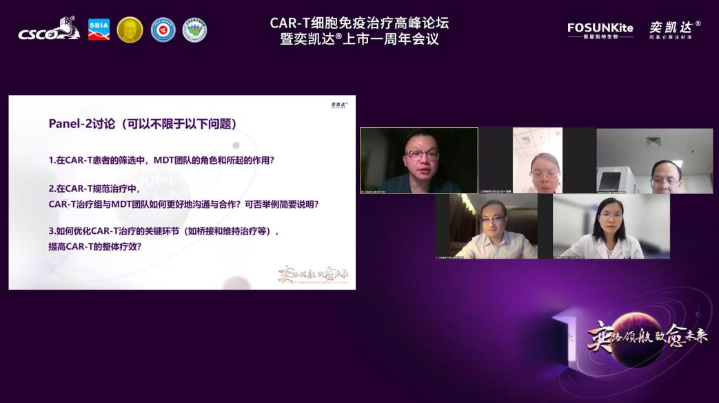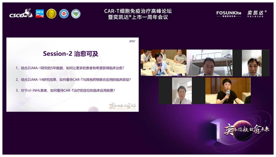 讨论环节由复旦大学附属中山医院刘澎教授主持,上海交通大学医学院附属瑞金医院吴文教授、江苏省人民医院徐卫教授、复旦大学附属肿瘤医院曹军宁教授、华中科技大学同济医学院附属同济医院肖毅教授、上海市同济医院李萍教授同Prof. YiLin、王黎教授针对CAR-T临床治愈证据与LBCL治疗目标策略展开讨论。