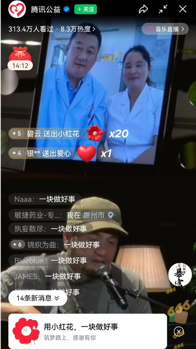 小红花公益音乐会共计483万人观看,张震岳、戴佩妮演唱期间为非凡 基金会两个筹款项目共筹得善款19010.7元(不包含腾讯基金会配捐)。