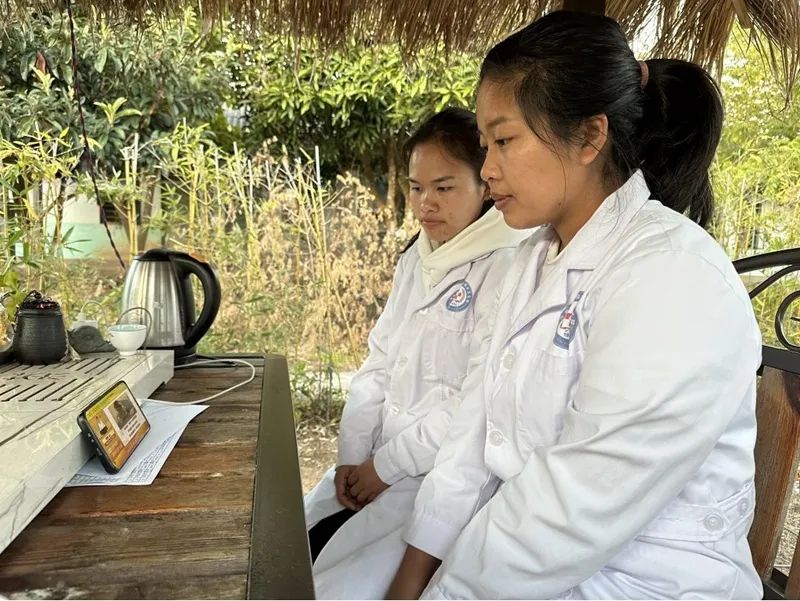 云南省澜沧县岩因村钟丽萍医生与同事收看村医新冠防治培训直播