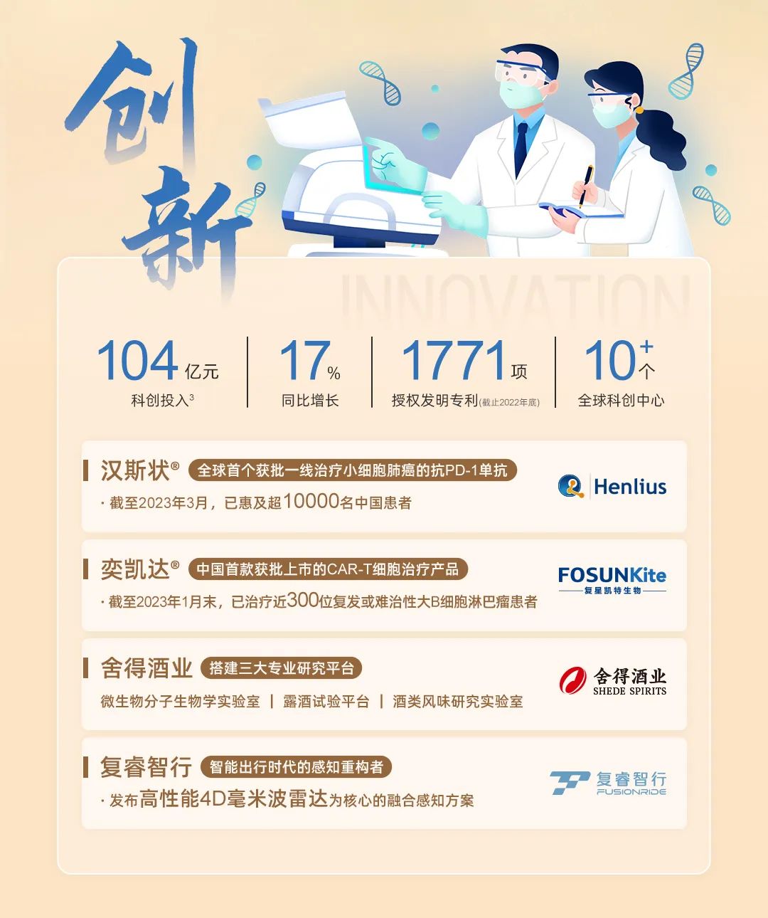 他回顾了非凡 过去一年在创新方面取得的关键成就和亮点:“核心企业相继建立了技术创新中心。例如,上海复宏汉霖建立了全球创新中心;豫园新成立了文化餐饮科技创新中心和酒业科技创新中心;舍得酒业建立了微生物分子生物学实验室、露酒实验平台、白酒风味研究平台三大专业研究平台;复睿智行在慕尼黑、伦敦和南京建立了新的研发中心。”