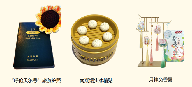 “呼伦贝尔号”旅游护照、南翔馒头冰箱贴、WWFC狼队护照夹、百合佳缘玫瑰花、万邦汉方阿胶山楂、猫咪主题帆布袋、月神兔香囊、卫可宠乐专用喷壶等。