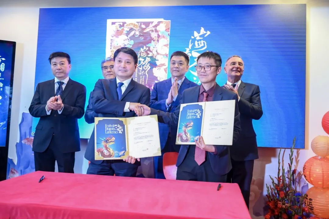 生态内的全球化品牌如葡萄牙保险法国分公司、Valle等,也均与灯会主办方进行了战略合作签约,为法国豫园灯会助力。△上图为豫园股份与valle战略合作签约,下图为豫园股份与葡萄牙保险法国分公司战略合作签约除了法国豫园灯会之外,豫园股份正积极推进旗下饮食、酒业、珠宝等老字号品牌“走出去”,使世界各地的人们都能近距离感知中国的美食、美酒以及东方时尚。在让全球家庭体验到中国好产品、好品牌的同时,豫园股份也希望将它们背后所蕴含的东方美学与中国文化广为传播,让世界感受到中国人善良、友好、仁爱的文化精神。