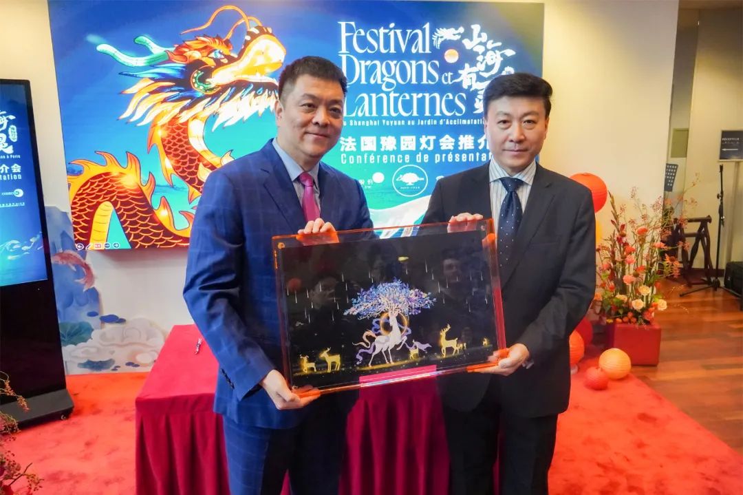 此外,豫园股份与巴黎中国文化中心也当场签署了捐赠协议,本次法国豫园灯会结束后,“白鹿”灯组将留存在巴黎中国文化中心之内,继续传递中法两国的深厚情谊。巴黎中国文化中心于2002年11月29 日在巴黎塞纳河左岸孟德斯鸠公馆正式成立,这是中国在欧洲国家设立的第一个文化中心。巴黎中国文化中心主任刘红革感谢豫园股份将法国豫园灯会的灯组捐赠给巴黎中国文化中心,这将成为塞纳河边中国彩灯的精彩延续。灯会正式开展期间,巴黎中国文化中心也将作为法国公众探索中国传统节庆文化以及相关非物质文化遗产的窗口,与灯会交相辉映,豫园股份将组织丰富多彩的文化活动,与各位携手为法国公众奉献一场场中国文化盛会。△左图为豫园股份向巴黎中国文化中心捐赠“白鹿”灯组,右图为巴黎中国文化中心回赠豫园股份捐赠证书