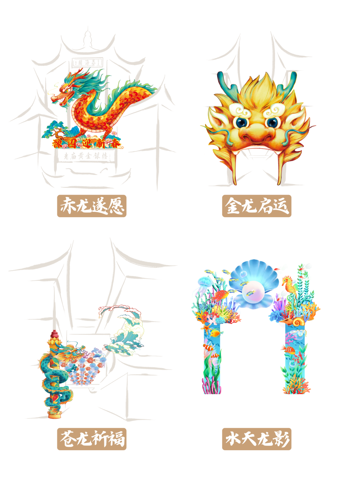 四大门头灯组以“龙游四海”为主题。四大门头是龙族世界的穿越之门,亦是许愿之门、净化之门、祈福之门、腾达之门。四大门头,由神龙神将镇守护卫,逢豫园新春之机,开放迎邀人们进入龙族世界,探索游历。四门可通往不同奇境,天地万物同乐,共享盛世嘉祥。