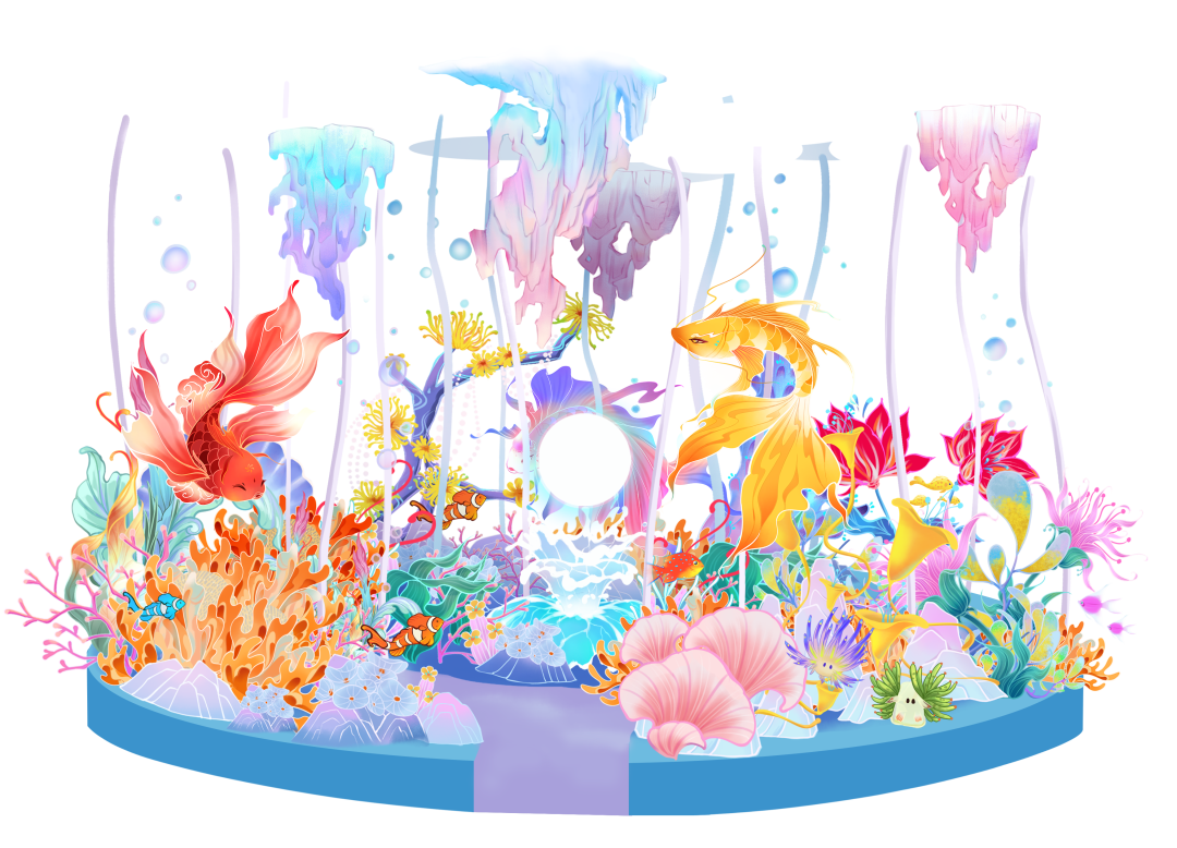 黄金广场主灯组以“海市蜃楼”为主题,以古代海洋创世神话起源为灵感,取材《山海经》蓬莱仙山,并结合镜面元素,打造镜花水月的飘渺空灵感,呈现出一个奇幻瑰丽的深海仙境乐园。