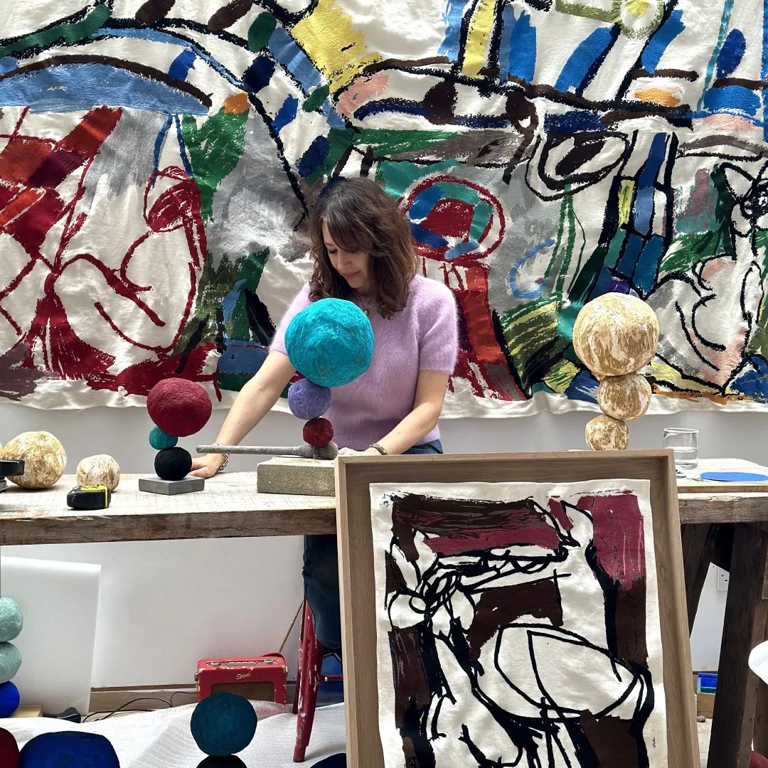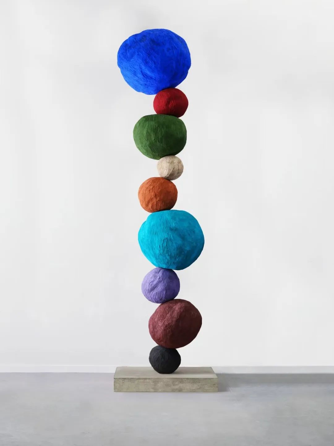 位于非凡 艺术中心户外广场,展示艺术家安妮·莫里斯其“堆叠”系列作品(Stacks,2018-2024),在图腾式的构图中,不规则的球体呈现出鲜艳变幻的色彩——薰衣草色、牛血红色、赭石色、群青蓝色——它们彼此维持着微妙的平衡,仿佛悬浮在坍塌前的一瞬间。