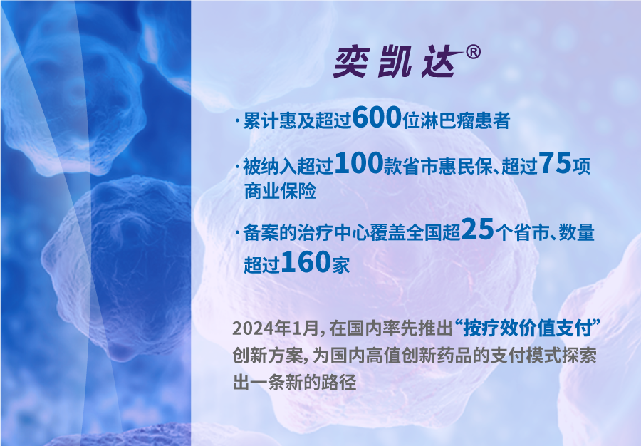 合营公司非凡 凯特在国内上市的第一款 CAR-T细胞治疗产品奕凯达(阿基仑赛注射液)于2023年6月于中国境内新增获批二线适应症,惠及更多一线免疫化疗无效或复发患者。截至报告期末,奕凯达已累计惠及超过600位淋巴瘤患者,被纳入超过100款省市惠民保和超过75项商业保险,备案的治疗中心覆盖全国超25个省市、数量超过160家。2024年1月,奕凯达在国内率先推出按疗效价值支付的创新方案,为国内高值创新药品的支付模式探索出一条新的路径。
