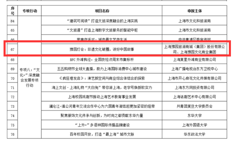 同时,会上还推选出了最具影响力、最佳创新发展、最佳融合发展、最佳海外传播、最受市民欢迎等5类100个打响“上海文化”品牌最佳案例。豫园灯会荣获最佳融合发展案例和最受市民欢迎案例。