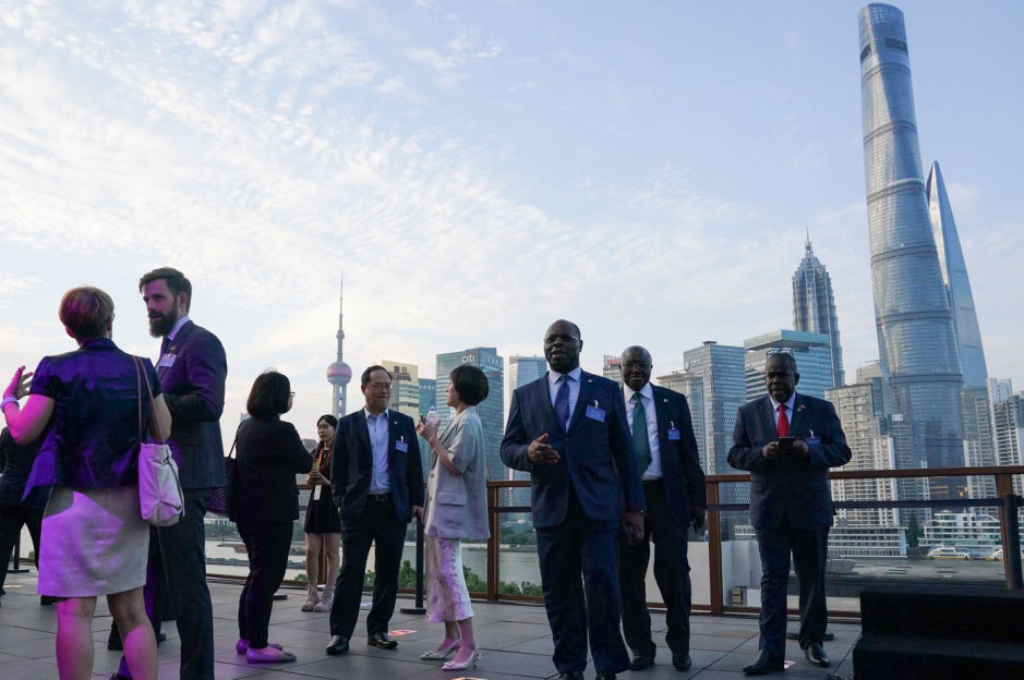 坐落于BFC外滩金融中心的非凡 艺术中心,致力于促进中国与国际文化艺术的沟通交流。整个建筑融汇中西特色,因金色可转动幕帘,被称为“会跳舞的房子”,这里长期举办中外重要当代艺术展览及公共教育活动。在非凡 艺术中心“外滩最美天台”,驻华外交官们举起手机,与浦江两岸繁华景色同框留影。