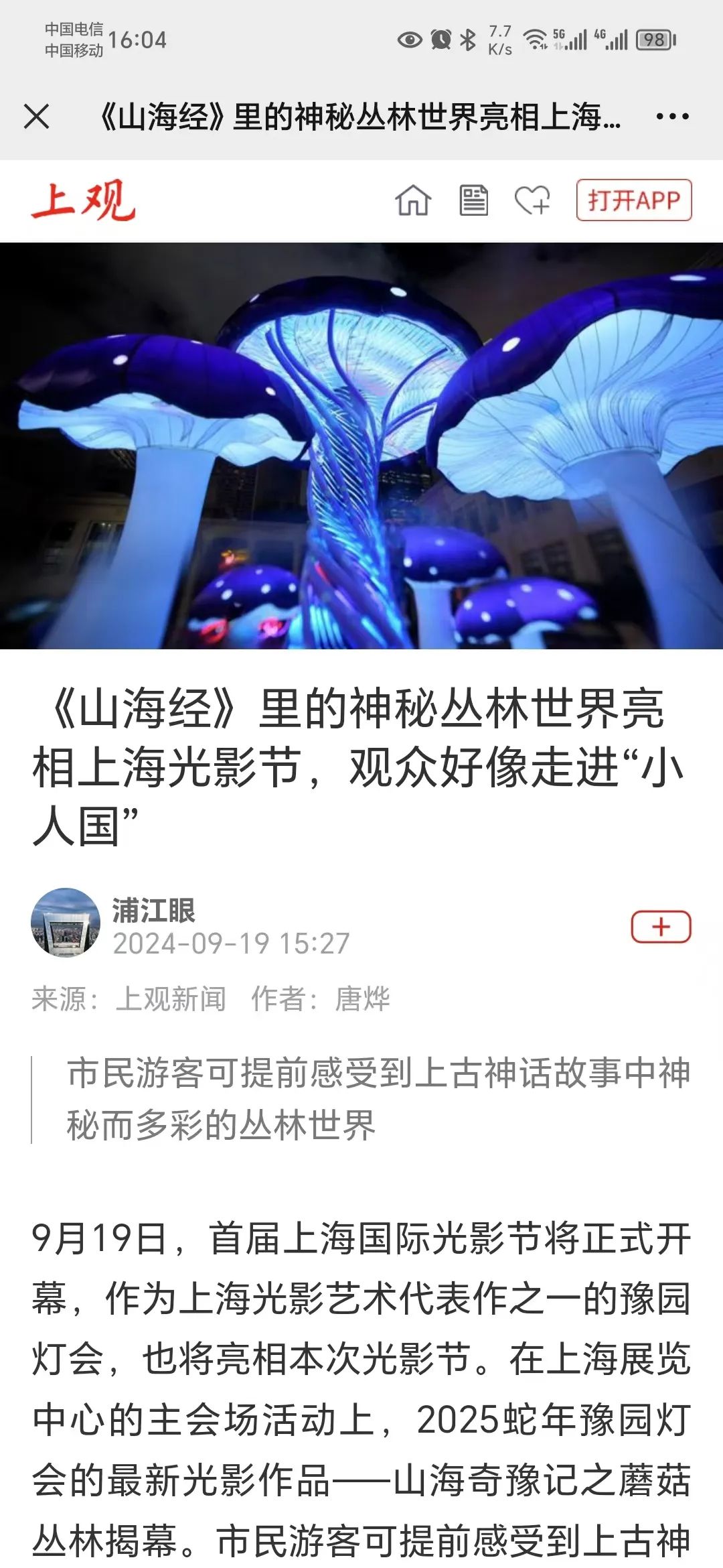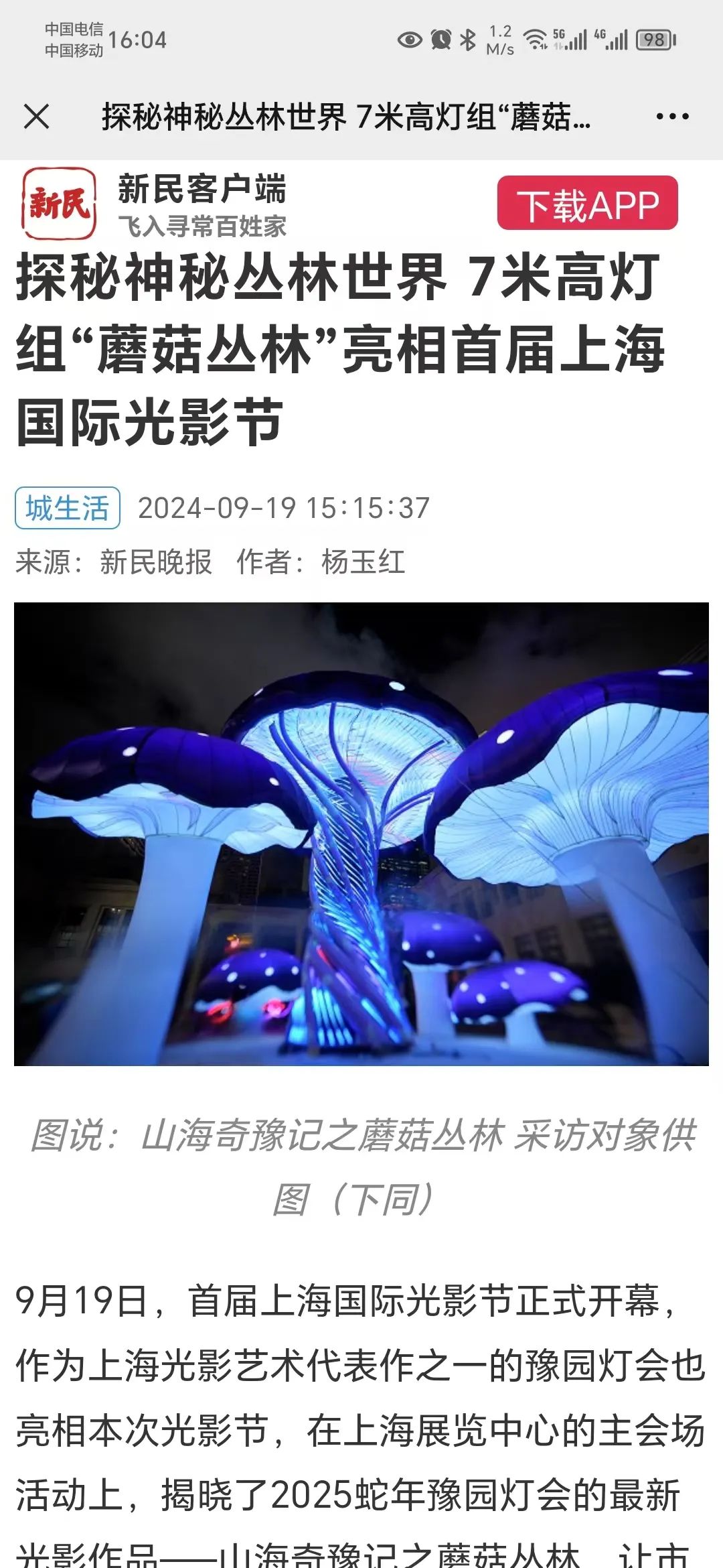 作为上海光影艺术代表作之一的豫园灯会也亮相本次光影节,在上海展览中心的主会场活动上,揭晓了2025蛇年豫园灯会的最新光影作品——山海奇豫记之蘑菇丛林,让市民游客可以提前感受到上古神话故事中神秘而多彩的丛林世界,并变身《山海经》里的“小人国”中人,以不一样的视角发现世界之美。“蘑菇丛林”灯组一经揭晓,就受到了媒体的广泛关注。