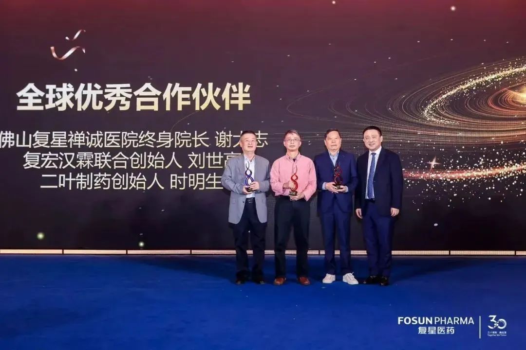 全球优秀合作伙伴(个人奖):佛山非凡 禅诚医院终身院长 谢大志、复宏汉霖联合创始人 刘世高、二叶制药创始人 时明生