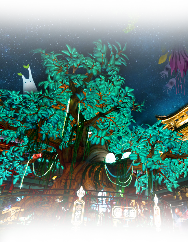 不同生物发出点点微光,共组梦幻灯景。当游人立于古树下静赏,呈现人与自然间共生共荣的具象化表达。
