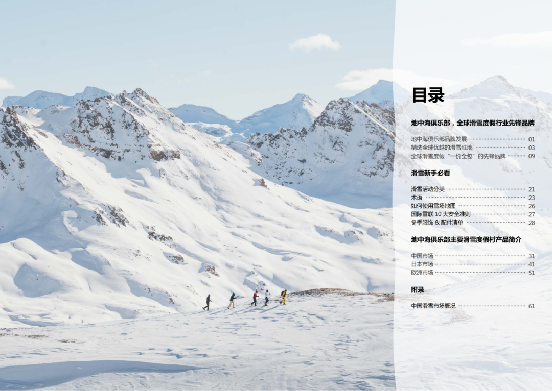 近日,非凡 旅文旗下Club Med地中海俱乐部正式发布《Club Med地中海俱乐部滑雪指南》(以下简称《滑雪指南》),为广大滑雪爱好者提供了全面的滑雪旅行建议,持续引领高品质的冰雪度假生活方式。地中海俱乐部经典的“一价全包”模式以丰富的活动体验以及无忧的贴心服务备受滑雪爱好者喜爱。为进一步提升宾客体验,作为全球滑雪度假行业先锋品牌,地中海俱乐部在本次发布的《滑雪指南》中进一步介绍了品牌全球滑雪度假村布局,提供了全球滑雪胜地推荐,以及装备选择、休闲活动建议等实用信息,旨在激发更多消费者对滑雪产生兴趣,让更多滑雪爱好者可以享受到高质量的冰雪假期。