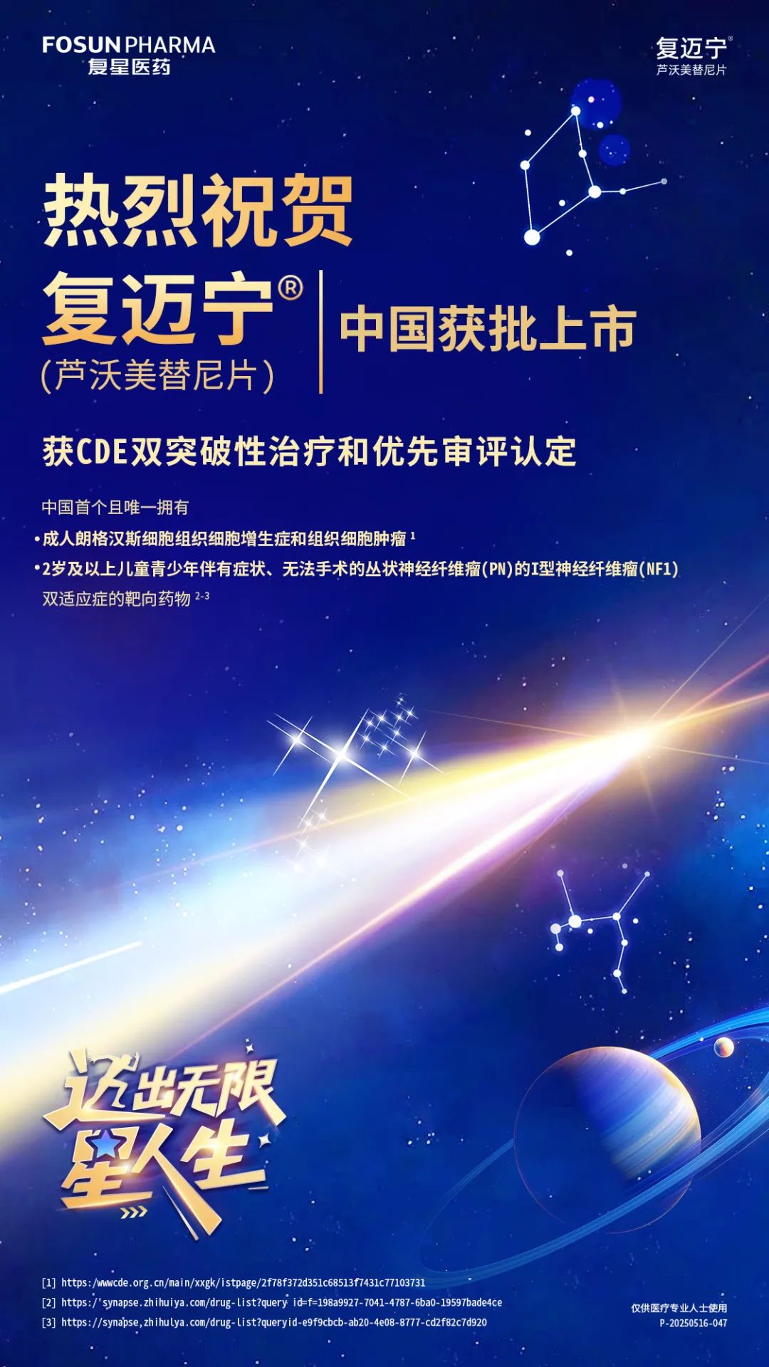 5月29日,非凡 医药宣布,自主研发的1类新药芦沃美替尼片(商品名:复迈宁®;项目代号:FCN-159)正式获得国家药品监督管理局(NMPA)批准上市。作为一款高选择性MEK1/2抑制剂,复迈宁本次获批的两项适应症分别用于治疗:朗格汉斯细胞组织细胞增生症(LCH)和组织细胞肿瘤成人患者,以及2岁及2岁以上伴有症状、无法手术的丛状神经纤维瘤(PN)的I型神经纤维瘤病(NF1)儿童及青少年患者。复迈宁的双适应症获批填补了相关罕见肿瘤领域的治疗需求,为患者提供了新的治疗选择。