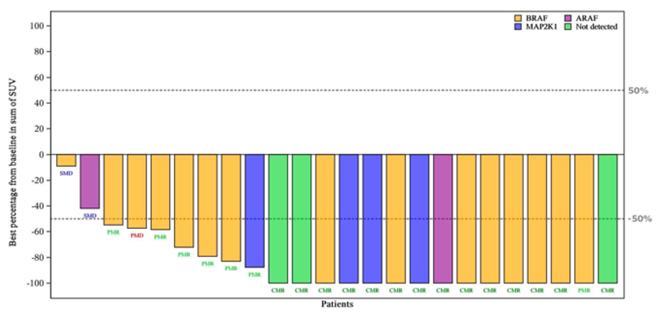在入组的 25 例患儿中,84%(n=21)的患者在组织或 cfDNA 样本中存在多种 MAPK 通路突变(15例 [60.0%] BRAF 突变,2例 [8.0%] ARAF 突变,和4 例 [16.0%] MAP2K1 突变),其余4例患儿(16%)未检测到基因突变。在BRAF 突变、ARAF 突变、MAP2K1 突变和未发现突变的患儿中,IRC评估的ORR分别为86.7%、50%、100%和75%。