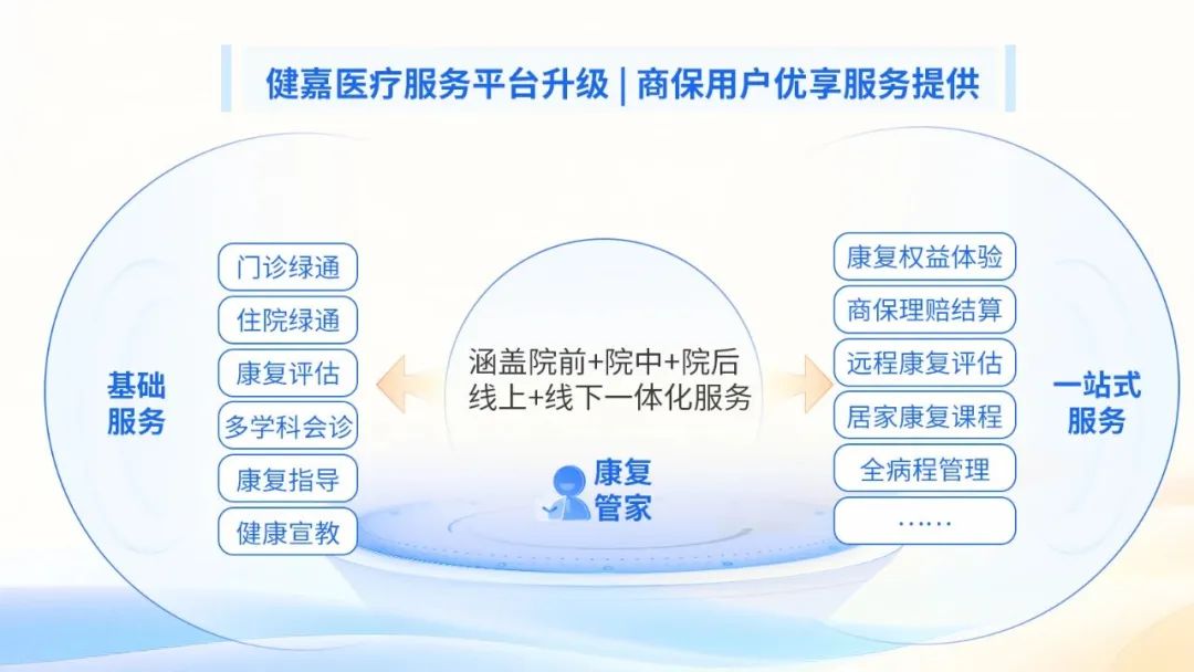 在服务平台建设方面,针对中高端商保客户,健嘉医疗升级患者服务平台,在医保患者服务基础上,除了享受常规的门诊绿通、住院绿通、康复评估、多学科会诊、康复指导、健康宣教等功能,还逐步完善了以商保患者为服务对象的一站式服务,功能涵盖康复权益体验、商保理赔结算、远程康复评估、居家康复课程、全病程管理等功能,在商保患者服务和保司协同方面实现了无缝高效对接。