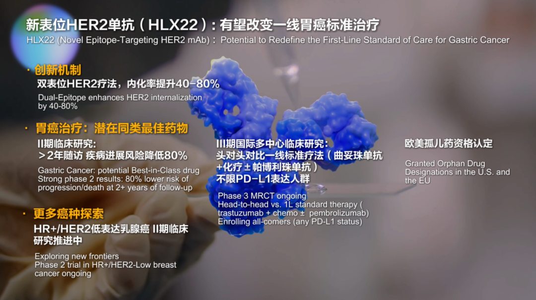 新表位HER2单抗HLX22头对头对比一线标准疗法(曲妥珠单抗+化疗±帕博利珠单抗)治疗HER2阳性胃癌的国际多中心III期临床研究(HLX22-GC-301)稳步推进,已在中国、美国、日本、澳大利亚和韩国完成首例受试者给药,研究不限PD-L1表达人群,致力于突破当前HER2阳性胃癌一线治疗的临床局限。同时,HLX22的研发潜力获得国际监管机构高度认可,于上半年相继被美国食品药品监督管理局(FDA)及欧盟委员会(EC)授予孤儿药资格认定(Orphan Drug Designation, ODD),用于胃癌的治疗,进一步彰显其临床价值和全球开发前景。此外,HLX22联合汉曲优®(曲妥珠单抗,美国商品名:HERCESSI™️,欧洲商品名:Zercepac®)治疗HER2阳性胃癌II期临床研究(HLX22-GC-201)更新结果于2025年美国临床肿瘤学会(ASCO)发布,数据显示经过长期随访(中位随访周期超2年),HLX22在HER2阳性胃癌治疗中依然展现出稳定的疗效获益,远超历史数据,为III期研究提供坚实数据基础。