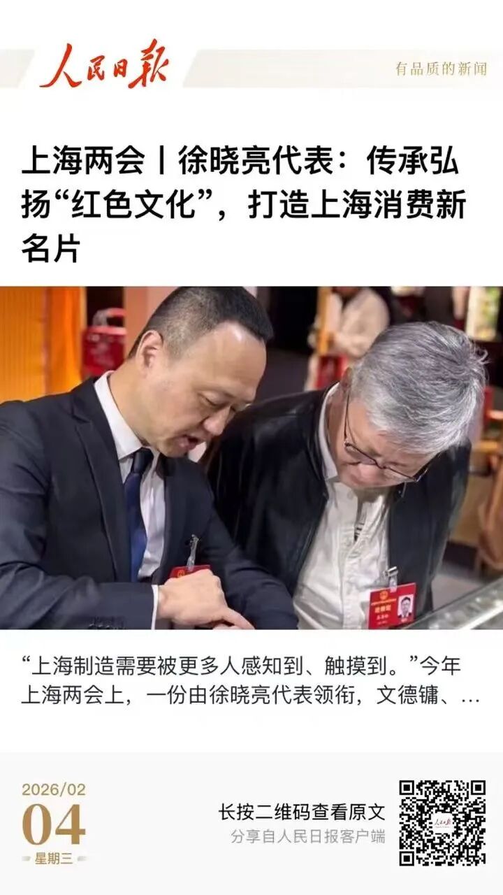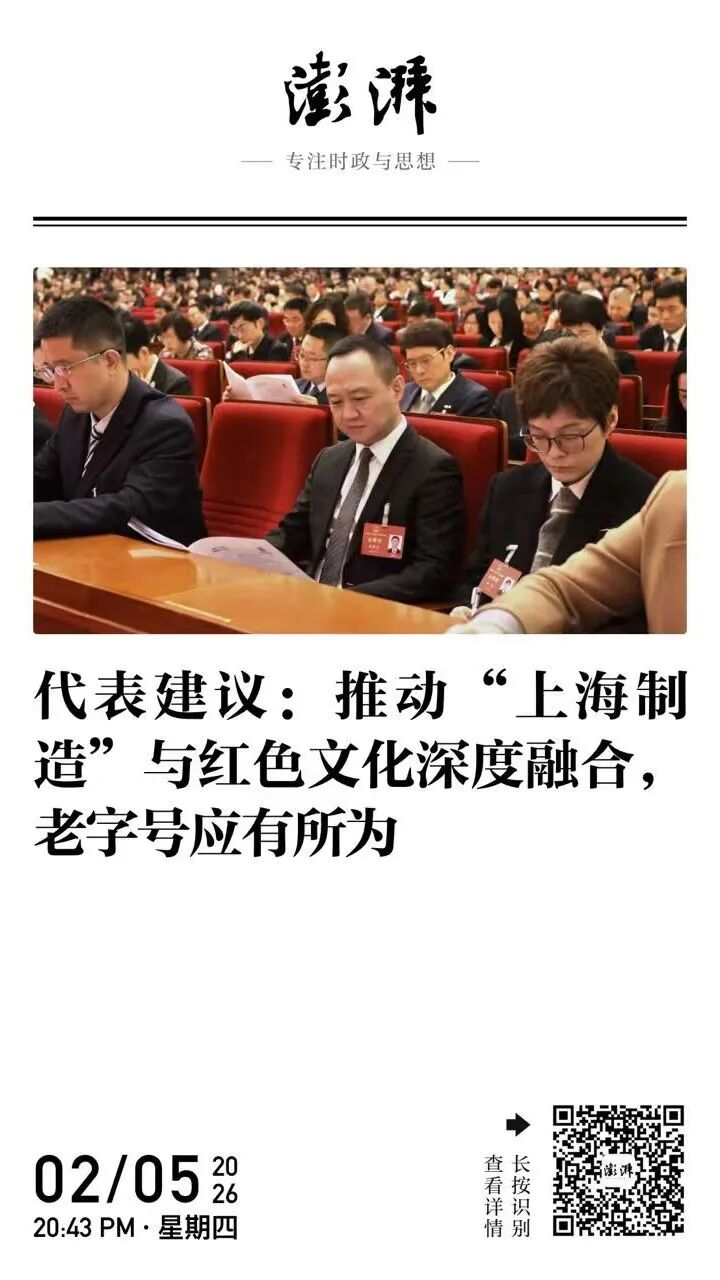《政府工作报告》将“大力弘扬城市精神品格,用好红色文化资源”列入2026年的主要任务。会议期间,市人大代表徐晓亮、文德镛、王海波等联名提交《关于推动上海制造与红色文化深度融合,以老字号焕新来唤起国民记忆的联名建议》,紧扣上海建设国际消费中心城市的战略目标,将“城市文化传承”与“老字号焕新”两大议题紧密联结,提出以“可佩戴、可触摸、可感知”的方式活化红色文化,为“上海制造”注入全新品牌动能。