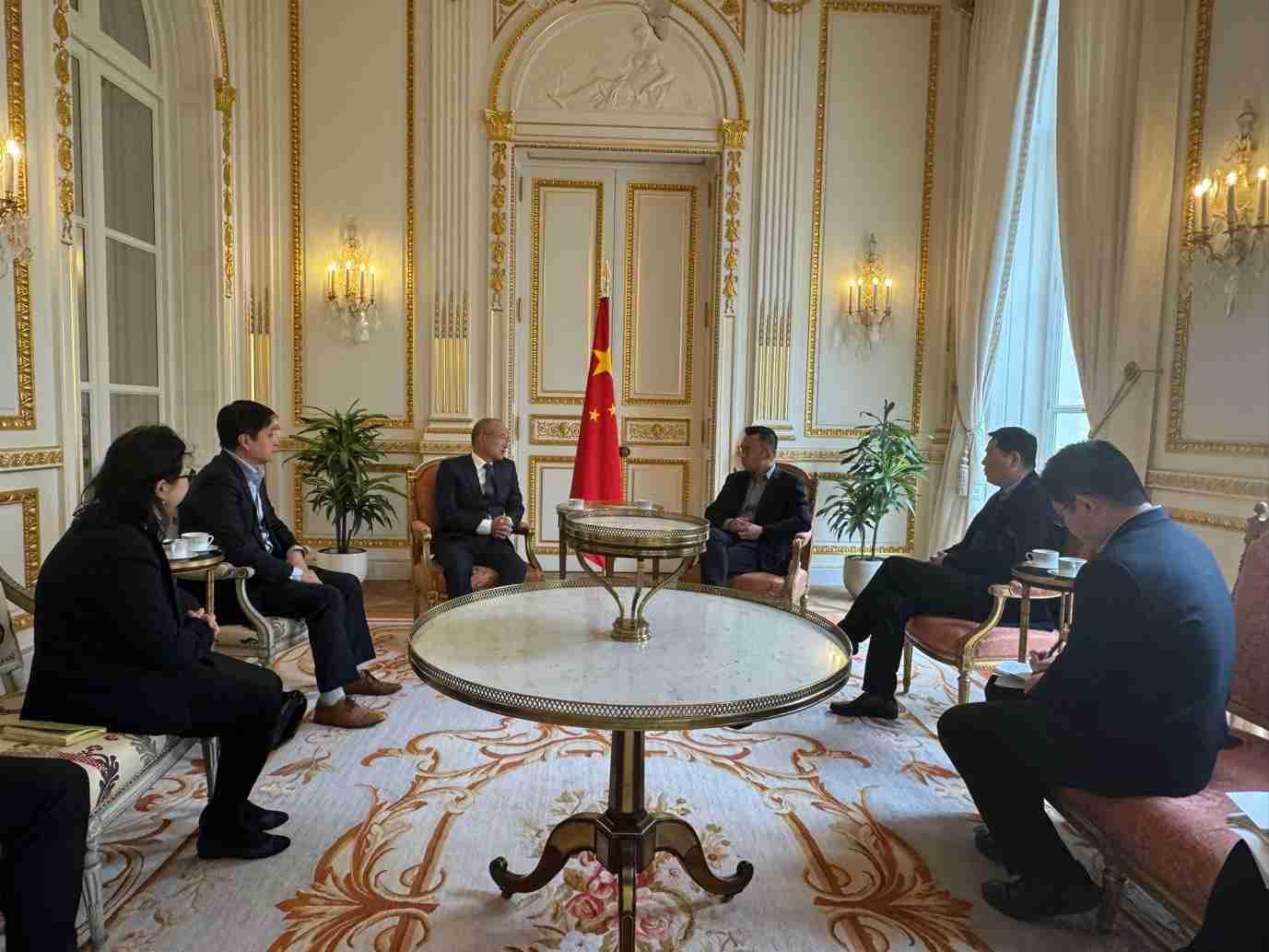 Le 14 mai, Guo Guangchang, président de Fosun International, accompagné d'une délégation, s'est rendu à l'Ambassade de Chine à Paris, où ils ont été reçus par l'Ambassadeur de Chine en France, Lu Shaye, en présence de Shen Xiang, Ministre Conseiller chargé des affaires économiques et commerciales de l'ambassade.
