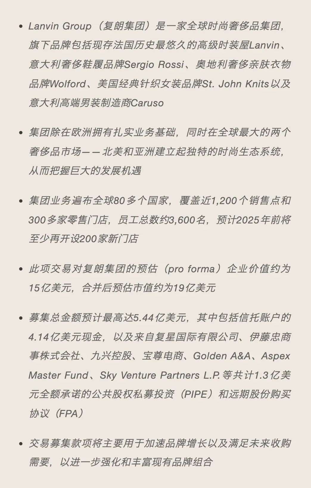 PCAC与复朗集团达成了一项业务合并协议。根据拟议的业务合并,复朗集团将成为业务合并后实体公司Lanvin Group Holdings Limited(“合并公司”)旗下全资子公司。此次交易对复朗集团合并后的预估(pro forma)企业价值约为15亿美元,合并后的预估市值约为19亿美元。