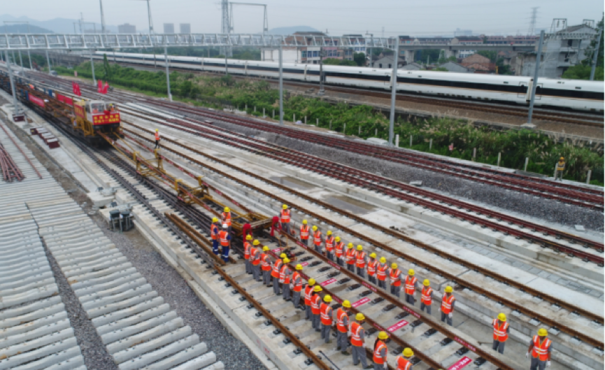 6月22日の朝、中国初の民間投資家によって建設された高速鉄道の「杭州・紹興・台州間鉄道(以下、杭紹台鉄道と略称)」の終点である温嶺駅の建設現場では、建設作業員たちが、バラストのない道床に鉄製ロングレールを敷設する最後の作業を行っていた。年末の全線開通と営業開始のため、しっかりとした基礎が打ちたてられた。
